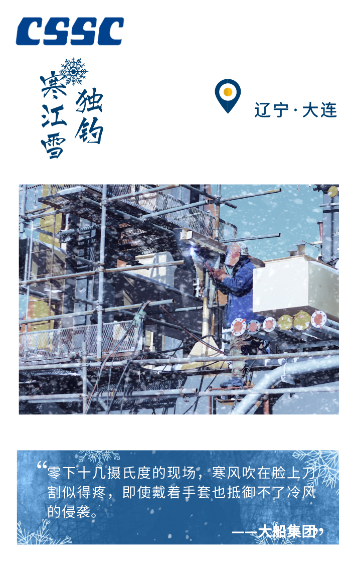 -5℃、-10℃、-20℃ …… 在這個(gè)不斷刷新寒冷指數(shù)的冬季 從未缺席中國船舶人勞作的身影 皎潔的白雪、火紅的爐膛 呼嘯的海風(fēng)、疾行的足音 奏響了冬季船舶人的 冰與火之歌