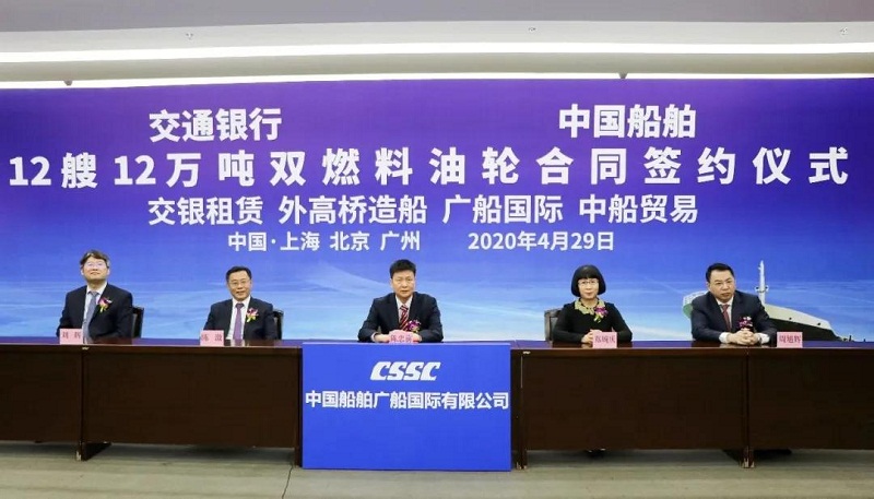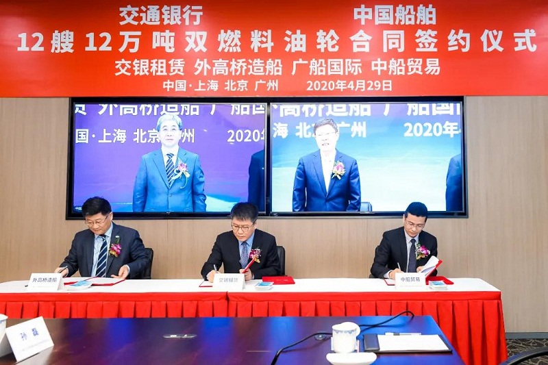 ????4月29日,中國船舶集團有限公司旗下中國船舶工業(yè)貿易有限公司、上海外高橋造船有限公司、廣船國際有限公司與交通銀行股份有限公司旗下交銀金融租賃有限責任公司在北京、上海、廣州三地以“云簽約”方式簽署12艘12萬噸雙燃料油船建造合同,合同總金額約46億元人民幣,這是中國船舶集團旗下單位近期承接的又一單筆大額訂單。中國船舶集團黨組書記、董事長雷凡培,交通銀行黨委書記、董事長任德奇,中國船舶集團黨組成員、副總經(jīng)理孫偉,交通銀行黨委委員、副行長呂家進出席簽約儀式。