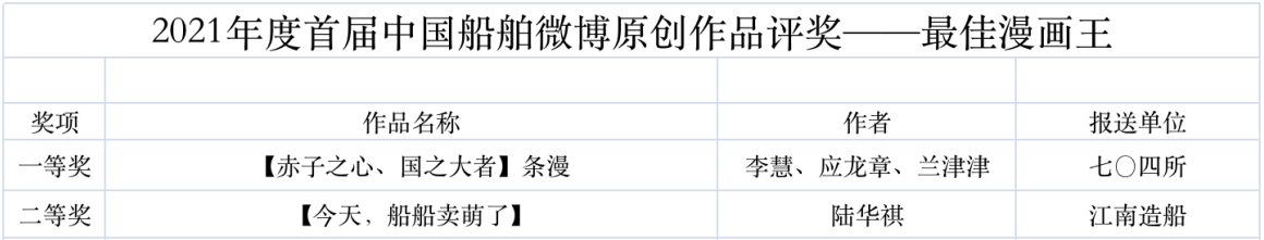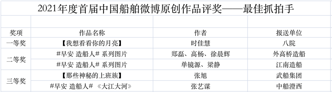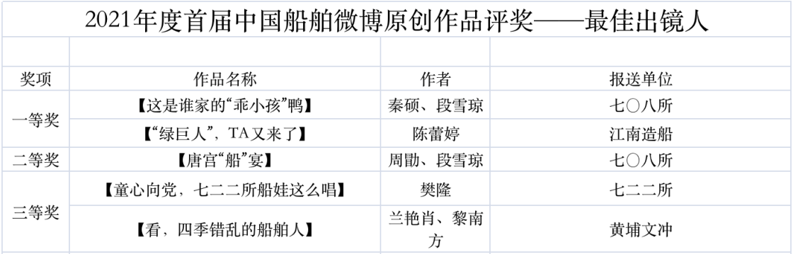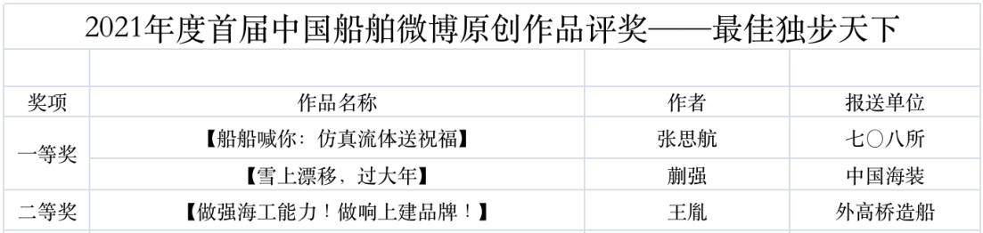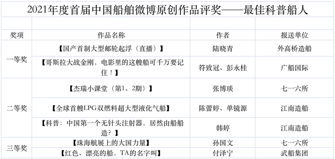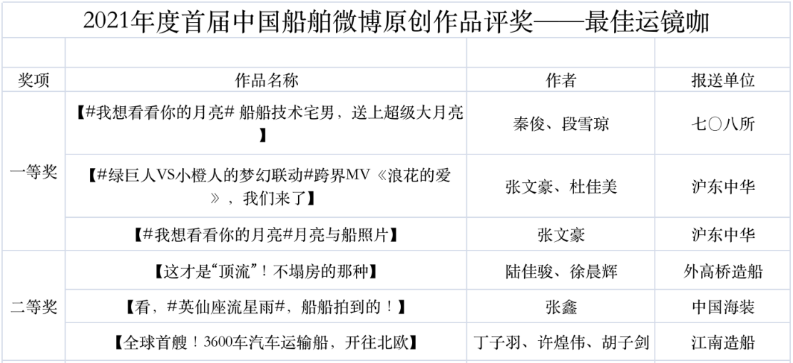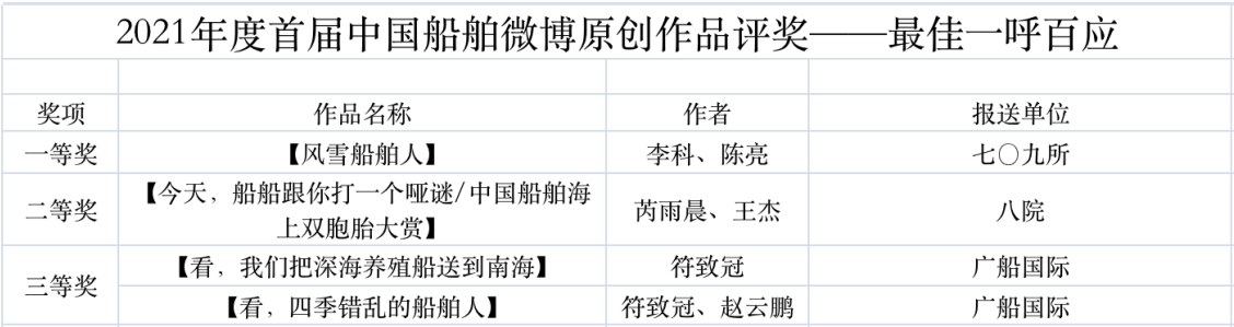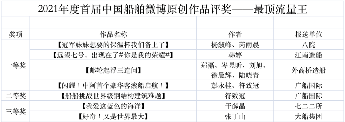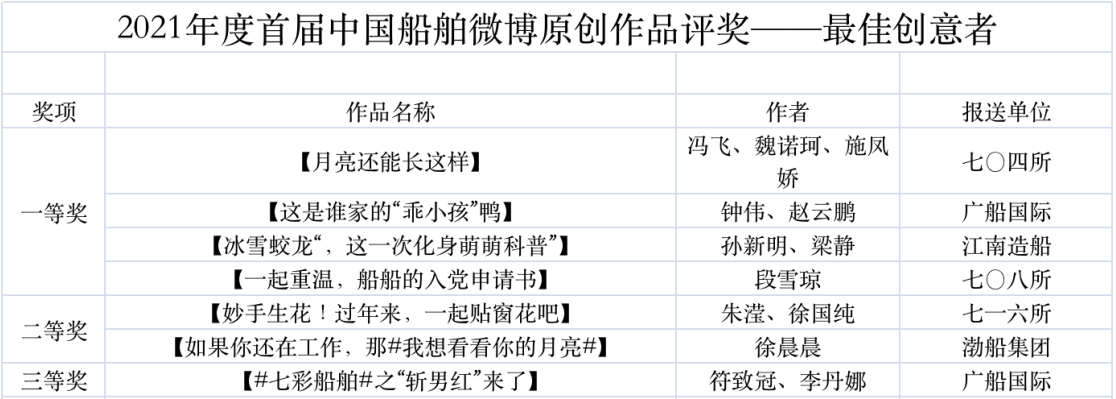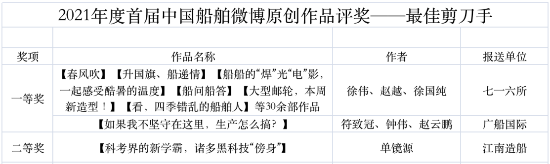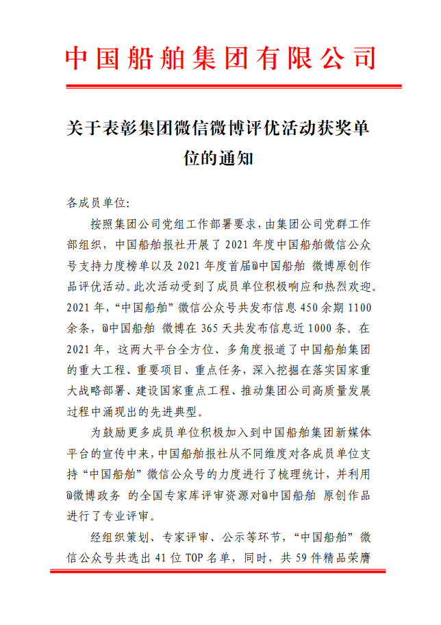 為鼓勵更多成員單位積極加入到中國船舶集團新媒體平臺的宣傳中來,在集團公司黨群工作部的指導(dǎo)下,中國船舶報社從不同維度,對2021年度各單位支持“中國船舶”微信的力度進行了梳理統(tǒng)計,并利用微博政務(wù)的全國專家?guī)煸u審資源,對2021年度“中國船舶”微博原創(chuàng)作品進行了專業(yè)評審,評選結(jié)果公布如下: