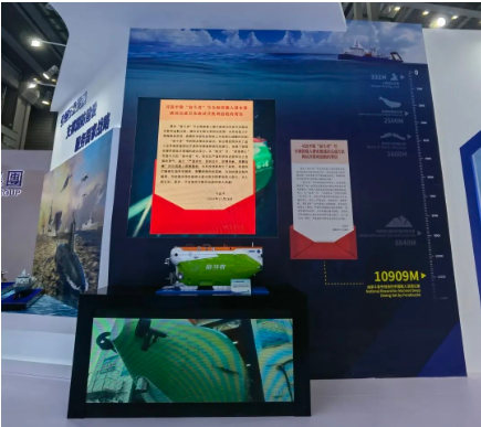 吸引眼球的還有“奮斗者”號(hào)載人潛水器,以及雪龍-2號(hào)、遠(yuǎn)望7號(hào)等深海極地重大裝備、航天測(cè)量船家族。在展臺(tái)處,不僅播放了“奮斗者”號(hào)萬米深潛坐底激動(dòng)人心的畫面,還展示了習(xí)近平總書記的賀信,激勵(lì)中國(guó)船舶人踔厲奮發(fā)、勇毅前行。