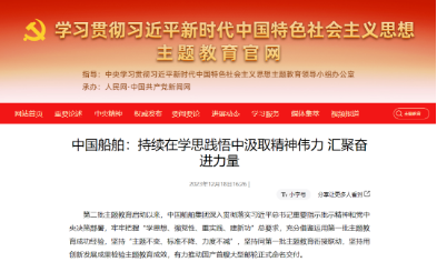 12月18日,學(xué)習(xí)貫徹習(xí)近平新時(shí)代中國特色社會(huì)主義思想主題教育官網(wǎng)發(fā)布《中國船舶:持續(xù)在學(xué)思踐悟中汲取精神偉力 匯聚奮進(jìn)力量》。中國船舶集團(tuán)通過繪好“施工圖”、念好“三字經(jīng)”、用好“五字訣”等扎實(shí)開展好主題教育,切實(shí)以主題教育成果推動(dòng)集團(tuán)公司加快建設(shè)世界一流船舶集團(tuán)。