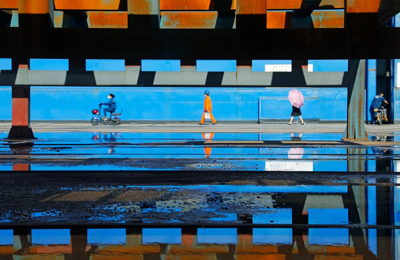 夏日清晨,一場大雨過后空氣透亮清新,廠區(qū)高跨門口服裝各異的職工行走在上班的路上,空地上擺放的工裝架與其自身的投影形成了獨(dú)特的畫框,讓畫面中行走的職工雖小卻很突出,起重工亮橙色的服裝、撐起的雨傘與明亮的藍(lán)色跨門形成色彩對(duì)比,使畫面活潑跳躍,職工們形形色色又從容有序,勾勒出廠區(qū)一隅的美麗風(fēng)景。