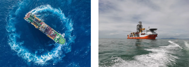 # 通過配置最先進的DP-3級動力定位系統(tǒng),自動調整船舶底部7臺推進器的轉向和推力大小,來抵抗海上風、浪、流作用在船上的載荷,使船舶在海上保持一定的水平位置;