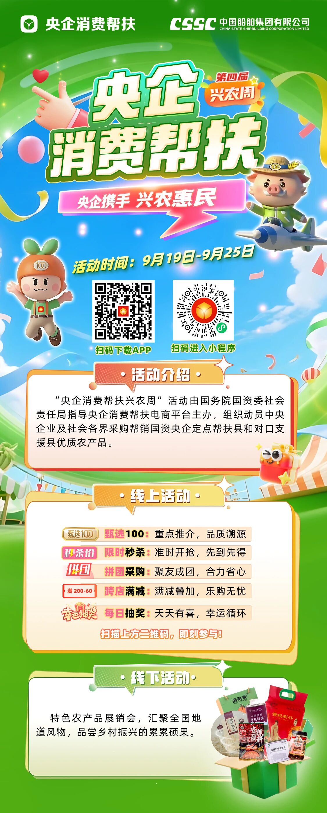 本屆“央企消費(fèi)幫扶興農(nóng)周”活動(dòng)時(shí)間為9月19日~9月25日,發(fā)布了央企消費(fèi)幫扶電商平臺(tái)助農(nóng)大數(shù)據(jù),線上開展限時(shí)秒殺、拼團(tuán)采購、跨店滿減等促銷活動(dòng),線下舉辦特色農(nóng)產(chǎn)品展銷會(huì)、創(chuàng)辦非遺等特色主題展,再搭配包括現(xiàn)場簽約、展位打卡等在內(nèi)的活動(dòng),共同打造了一場“能看、能嘗、能買、能玩”的“興農(nóng)”盛宴。