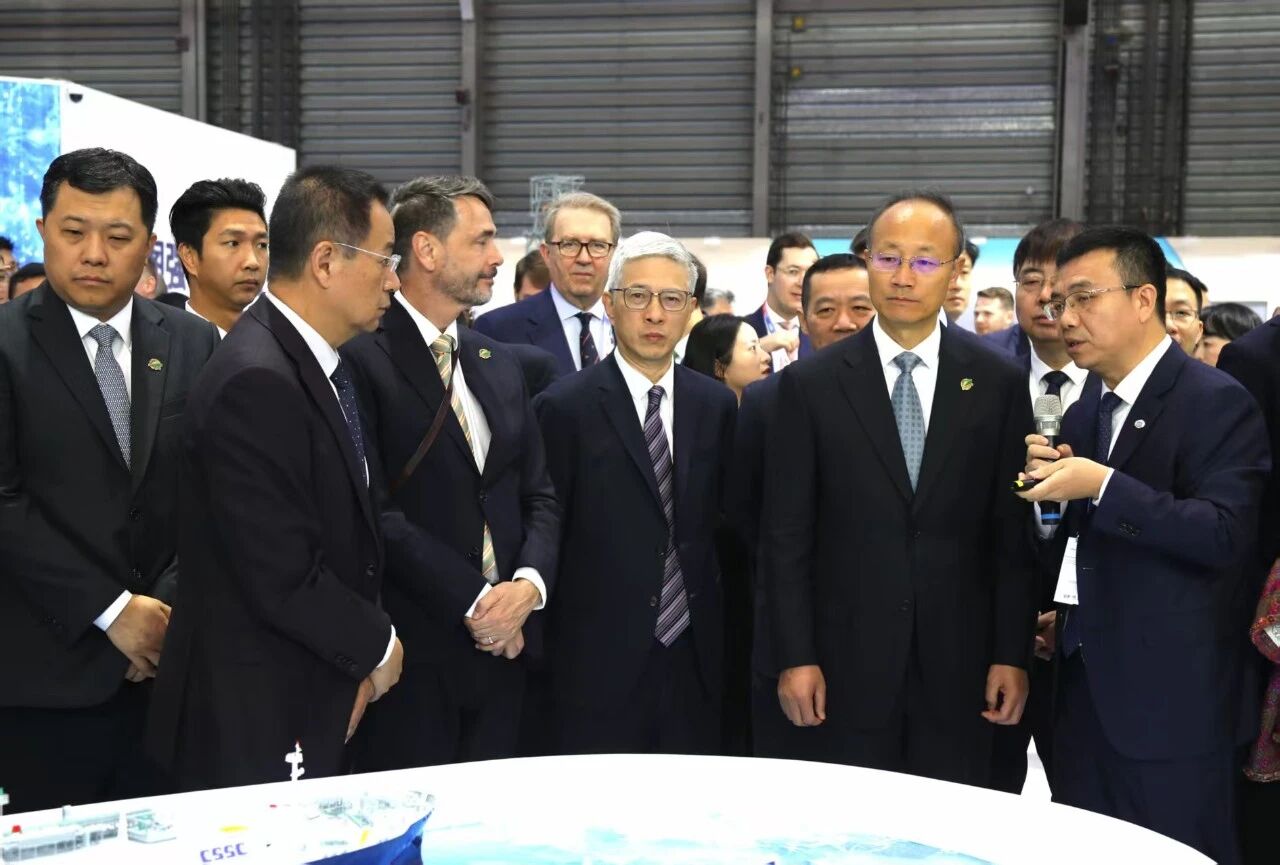 中國國際海事會展被譽為全球海事業(yè)的“風向標”,也是全球最具影響力和規(guī)模最大的海事專業(yè)會展。本次會展,中船集團展臺面積達4000平方米,以“向海圖強 智領深藍”為主題,聚焦“高端、綠色、智能、深海、極地、生態(tài)”主線,分設高端產品、綠色能源、智能技術、深海開發(fā)、極地探索、生態(tài)融合等六大展區(qū),集中展示中船集團品牌形象,呈現高端產品、卓越技術和生態(tài)服務。其中,“夢想”號大洋鉆探船、國產大型郵輪“愛達·花城號”、27.1萬立方米LNG船、核動力集裝箱船等旗艦產品,32.5萬噸甲醇雙燃料礦砂船等綠色船型以及WinGD10X92DF-M-1.0甲醇雙燃料主機、BrilliancE B型燃料艙、船舶碳捕集裝置等低碳零碳轉型重要裝備,“珠海云”號智能無人科考母船、“未來”號深遠海綠色智能技術試驗船等智能船舶平臺,“奮斗者”號等系列載人潛水器、“深海一號”等尖端探索裝備、深水鉆井平臺等深海開發(fā)裝備以及15萬噸智慧漁業(yè)養(yǎng)殖工船等深海裝備,“雪龍2”號極地科考破冰船、“極地”號破冰調查船等極地裝備等一系列代表中船集團最高水平和最先進研發(fā)能力的產品裝備和技術紛紛亮相,聚焦現代海事服務體系建設的生態(tài)融合區(qū)集中展示中船集團在供應鏈、貿易、服務等領域的開放合作競爭優(yōu)勢。