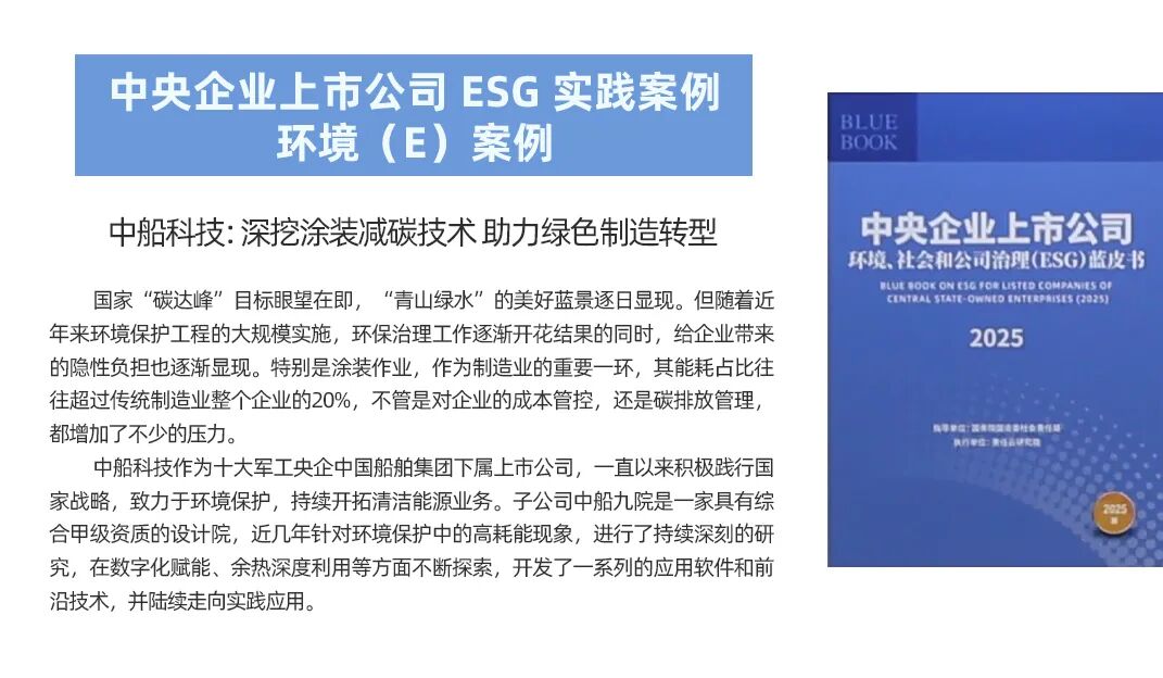 中船集團(tuán)旗下上市公司中船科技申報(bào)的《深挖涂裝減碳技術(shù) 助力綠色制造轉(zhuǎn)型》,聚焦環(huán)保治理工作,以技術(shù)創(chuàng)新助力產(chǎn)業(yè)轉(zhuǎn)型,為行業(yè)綠色發(fā)展提供了實(shí)踐示范,成功入選《中央企業(yè)上市公司環(huán)境、社會和公司治理(ESG)藍(lán)皮書(2025)》環(huán)境(E)案例。