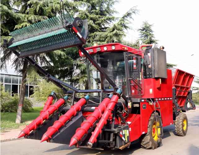 該大型農(nóng)機設(shè)備,可收割田地坡度小于5°,種植壟距1. 1~1.2米的甘蔗,能同時完成甘蔗的扶正、分蔗、切梢、跟切、喂入、輸送、除雜和集料轉(zhuǎn)運等作業(yè),不需要輔助工具,一次收割兩行,收割效率高。采用整桿式收割模式,有效解決了切斷式甘蔗存儲時間短的問題。獨特的切刀智能仿形系統(tǒng),使甘蔗跟切喂入更順暢,減小蔗徑損失率,且宿根切口平整,保證甘蔗來年發(fā)芽率。