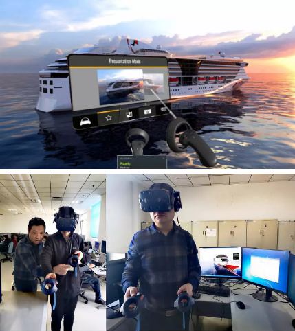 ????該平臺(tái)通過(guò)總體總師與三維造型師的協(xié)同交互,完成全船三維設(shè)計(jì)(全船造型和艙室內(nèi)部裝飾等)并搭建逼真場(chǎng)景,用戶通過(guò)穿戴智能頭顯,操縱控制手柄,真正實(shí)現(xiàn)了“漫步甲板、穿行船艙”的自主漫游體驗(yàn)。