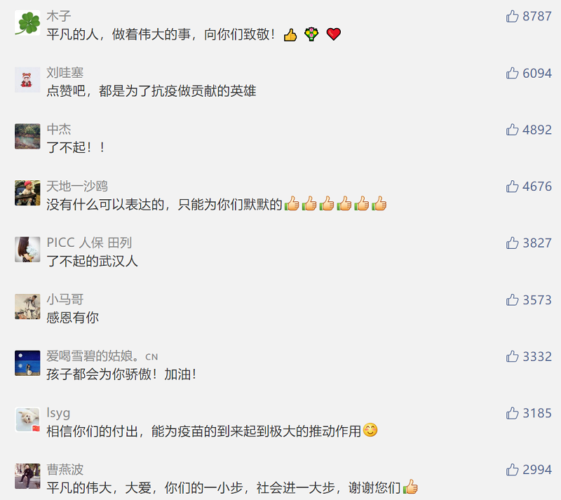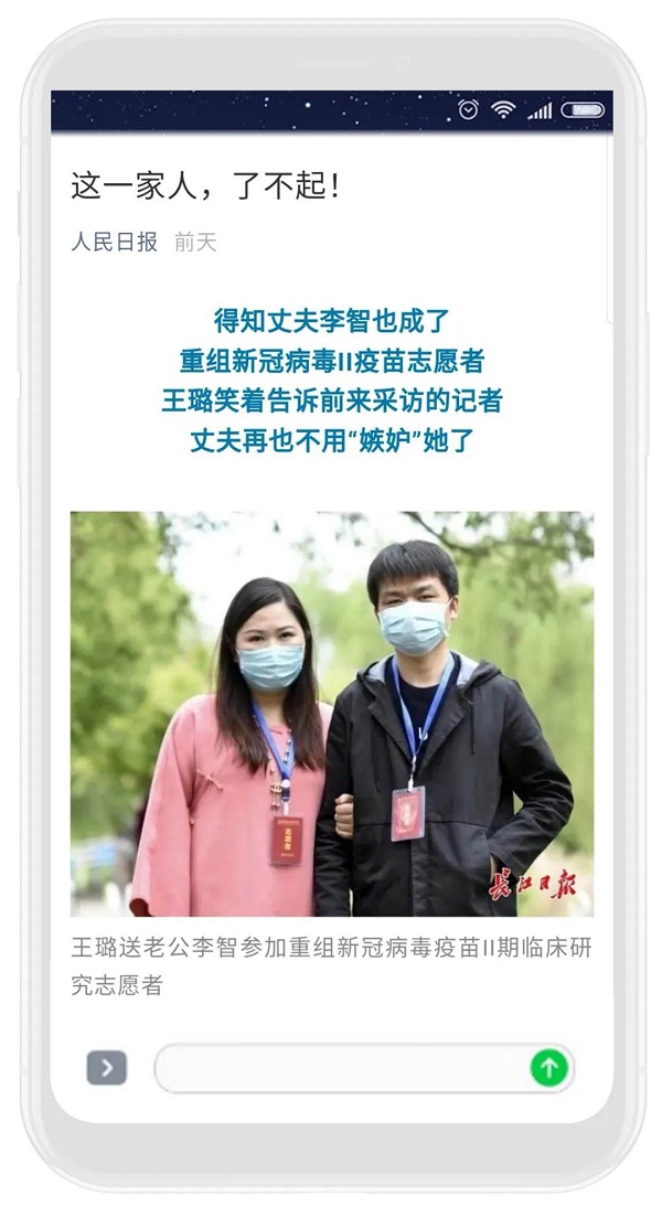 ????4月18日,人民日報(bào)微信公眾號推送了這樣一條消息,詳細(xì)介紹了一位土生土長的武漢人王璐及其家人自愿報(bào)名接種新冠疫苗的事跡,消息收獲了10萬+的閱讀量與3.2萬的“在看” ,還有動輒幾千的留言點(diǎn)贊!這位女主角王璐來自中國船舶集團(tuán)七一七所,不同于第一批結(jié)束醫(yī)學(xué)觀察的志愿者,王璐所在組的年齡在20歲到50歲,是最早一批高劑量的接種者。