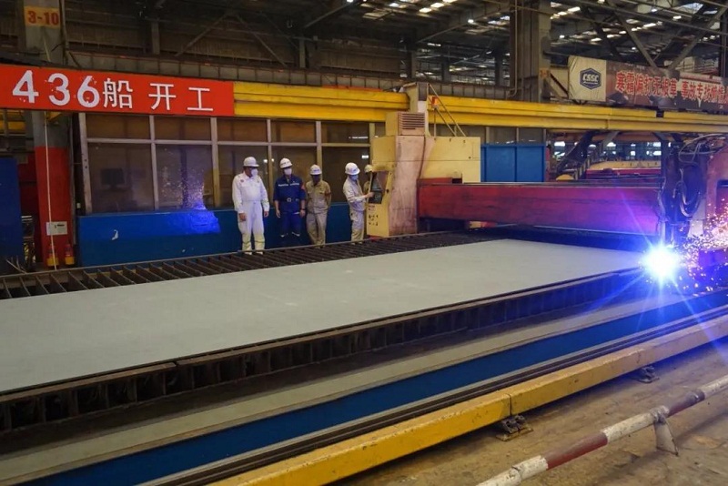 ????5月19日,中國船舶集團(tuán)旗下外高橋造船為PTM公司建造的11.4萬噸阿芙拉油輪2號船H1436船順利開工。本項目也是繼5月12日首制船H1435船順利開工時隔一周后雙方再度攜手合作實現(xiàn)的又一重要節(jié)點。受疫情影響,船東駐廠組代表無法到場,委托美國船級社(ABS)代表驗收開工鋼板情況見證鋼板切割并以“云簽字”的形式,簽署開工節(jié)點證書。