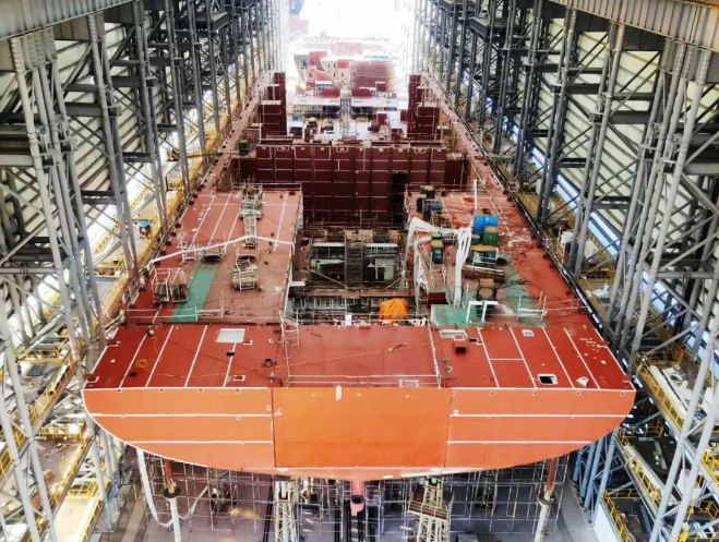 ▲機艙成型,室內(nèi)船臺生產(chǎn)流程基本打通