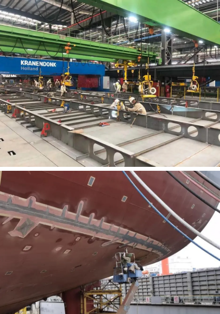 安環(huán)保衛(wèi)部安保消員工堅守崗位,保障大型郵輪作業(yè)安全;集配部碼頭鋼板抓緊卸貨,全力保障生產;制造二部400余名員工投入大型郵輪薄板分段建造;涂裝部800余名員工對大型郵輪/民船關鍵項目進行涂裝;搭載部1300余名員工堅守崗位保證船塢節(jié)點;總裝一部400余人圍繞止鏈器/艙口圍導軌安裝等開展生產,總裝二部對大型郵輪總段扣壓管穿艙件進行焊接;生產保障部開展大型郵輪臨時電力系統(tǒng)新式電箱改造。
