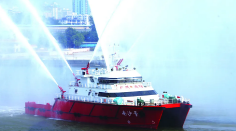2010年12月28日,廣船國際為南沙區(qū)建造的“南沙號(hào)”消防船投入使用?!澳仙程?hào)”消防船總長46米,型寬15米,排水量達(dá)到680噸,航速可達(dá)32.4公里/小時(shí),共設(shè)置有6門水炮。其中,2門主炮射程可達(dá)到150米,4門副炮射程可達(dá)到130米;還設(shè)置了全船水幕保護(hù)系統(tǒng),在火災(zāi)現(xiàn)場可有效保護(hù)自身安全?!澳仙程?hào)”消防船是當(dāng)時(shí)國內(nèi)最大雙體專勤消防船,大大增強(qiáng)了對船舶火災(zāi)、石化碼頭、油庫火災(zāi)的撲救能力。