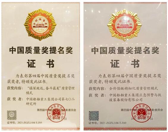 9月16日,在中國質(zhì)量(杭州)大會(huì)上,第四屆中國質(zhì)量獎(jiǎng)評(píng)選結(jié)果揭曉,中國船舶集團(tuán)旗下七〇二所、中船應(yīng)急分別以“謀深致遠(yuǎn),奮斗最美”質(zhì)量管理模式、全價(jià)值鏈精細(xì)化質(zhì)量管理模式,榮獲第四屆中國質(zhì)量獎(jiǎng)提名獎(jiǎng)。