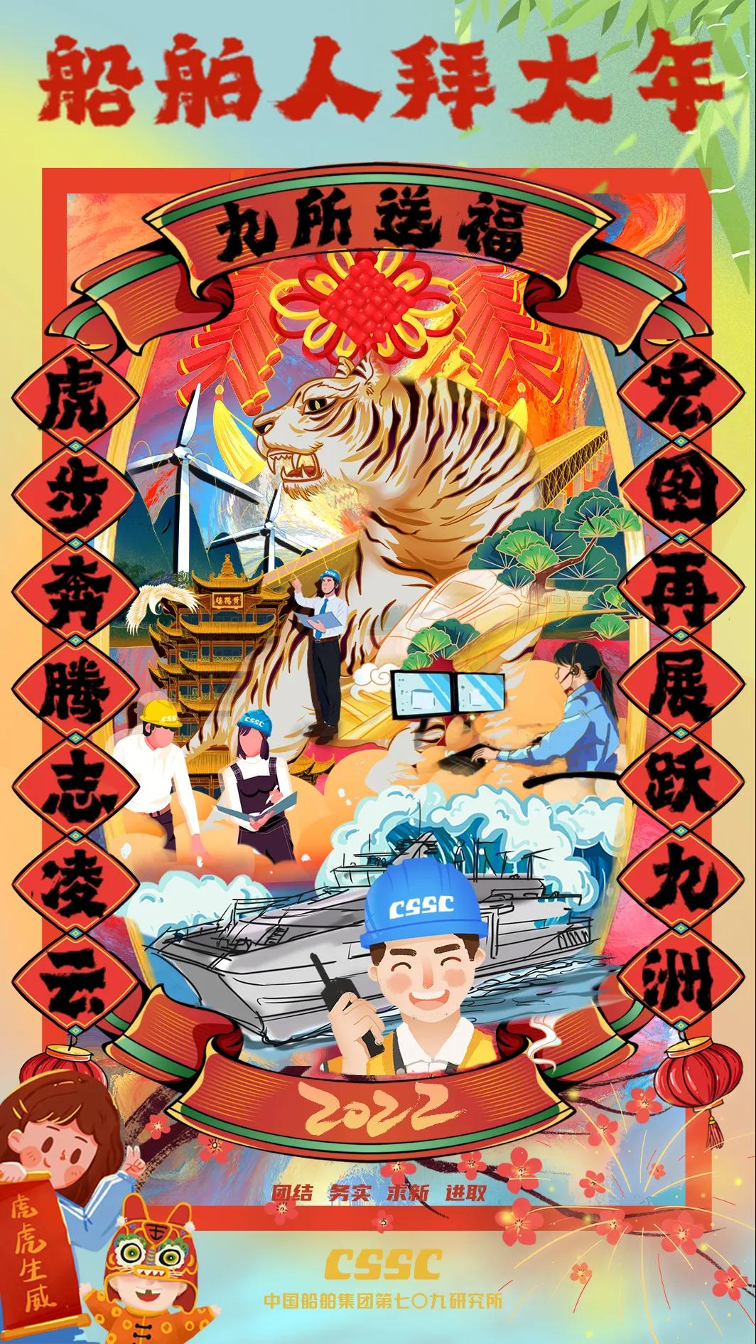 海報采用國潮畫風,中間部分“江小南”穿著新衣舉著虎頭,寓意新的一年中國船舶人虎虎生威,上面部分以重要產(chǎn)品和廠區(qū)設備為主,詮釋江南造船建造國之重器的初心和使命,同時輔以鞭炮、煙花、燈籠等新年元素,使海報充滿喜慶祥和的新年氛圍。