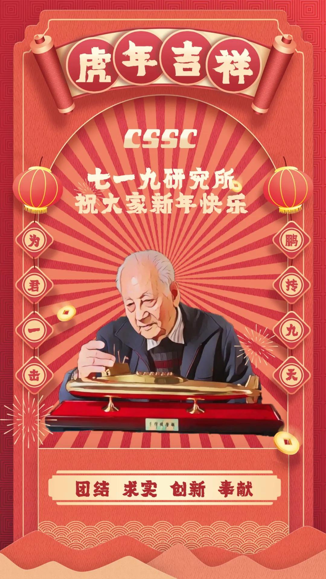 節(jié)日的煙花詮釋喜慶,大紅的燈籠點亮祝福!黃旭華院士作為七一九所典型人物代表,認真注視著他為之奉獻一生的艇,也反映了這條戰(zhàn)線上科技工作者們“團結、求實、創(chuàng)新、奉獻”的工作作風?!盀榫粨?鵬摶九天”暗藏“一九”二字,反映出七一九所肩負的責任之大,使命之重,表達了軍工人將船舶事業(yè)做大做強的決心。