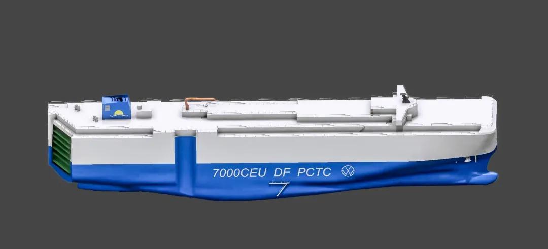 該型船可裝載7000輛汽車,采用先進的天然氣(LNG)/燃油雙燃料推進系統(tǒng)設(shè)計,可在3種燃料模式下航行,續(xù)航力最高可達15,000海里。配置了高壓岸電系統(tǒng),采取了減阻防污漆等各類節(jié)能措施,EEDI(能效營運指標)滿足國際海事組織最新的第二階段(phaseⅡ)要求,是一艘節(jié)能環(huán)保高效的汽車運輸船。