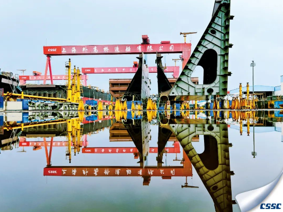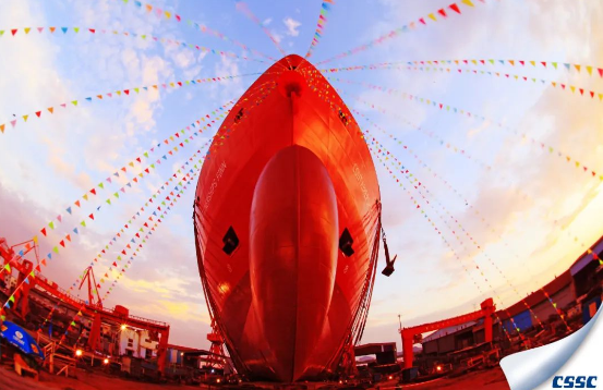 黃埔文沖建造的1400TEU雙燃料集裝箱船即將下水,美麗的船船與嫻麗多彩的天空融為一體,展現(xiàn)出一幅展翅欲飛場景。