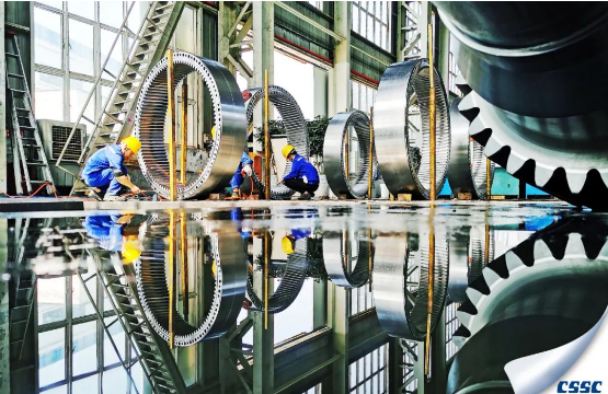 重齒公司工人們正在對風(fēng)力發(fā)電機內(nèi)齒圈進(jìn)行清洗及外觀檢查,而這疊映叢生的大小齒輪卻構(gòu)建出無與倫比的美妙景象。