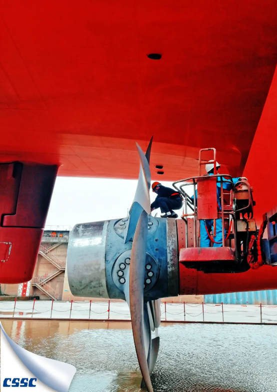 中午,船廠的工人們正在為設(shè)備最后調(diào)試,龐大的紅色船身和渺小的作業(yè)人員,形成了鮮明有趣的對比,正是有千千萬萬小小的我,成就了大大的深藍(lán)夢。