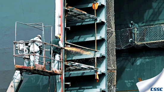 在30萬噸VLCC施工現(xiàn)場,大船人正在進(jìn)行艏艉兩大段合攏口部位的精度修正作業(yè)。該作業(yè)方式是大船集團經(jīng)過多年建造經(jīng)驗,通過三維數(shù)據(jù)管理、吊裝精度控制、環(huán)形段高精度切割等多種多部門協(xié)調(diào)后達(dá)到一次對接,標(biāo)志大船集團已完全掌握高難度高精度的合攏方式,在國際上富有極高的競爭力。