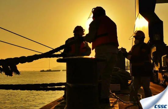 迎著朝陽,中船澄西船舶修造有限公司的帶纜工人們齊心協(xié)力,正在為一艘化學(xué)品船離泊解纜。