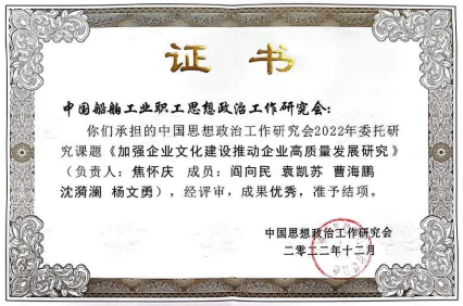 近日,由中國船舶工業(yè)職工思想政治工作研究會(huì)申報(bào)的中國思想政治工作研究會(huì)2022年委托課題《加強(qiáng)企業(yè)文化建設(shè),推動(dòng)企業(yè)高質(zhì)量發(fā)展研究》評審結(jié)果公布,成果優(yōu)秀,報(bào)經(jīng)中央宣傳部領(lǐng)導(dǎo)審定準(zhǔn)予結(jié)項(xiàng)。這是中國船舶政研會(huì)首次承擔(dān)中國政研會(huì)委托課題并獲評優(yōu)秀。