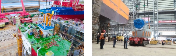“夢想”號配備的7臺推進器中,3臺全回轉伸縮推是黃埔文沖迄今總成過的最大伸縮推,并且建造過程中伸縮推需要進行全程升降試驗,升降高度差達4.3米。完成試驗的伸縮推總段重量超過了船廠龍門吊最高900噸的起重能力?!皦粝搿碧柟に囏撠熑笋T仕清創(chuàng)新性地提出了采用龍門吊和履帶吊聯合吊裝的方法,最終保證了伸縮推的成功安裝。