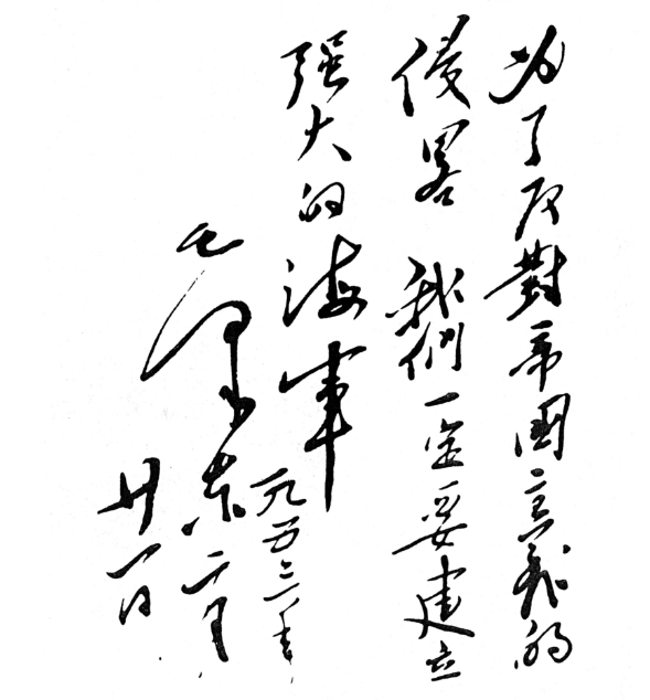 1953年2月19日,毛澤東在武漢登上長(zhǎng)江艦視察長(zhǎng)江中下游四省,并在長(zhǎng)江艦上為海軍題詞:“為了反對(duì)帝國(guó)主義的侵略,我們一定要建立強(qiáng)大的海軍?!贝葱兄聊暇珴蓶|提出要在南京檢閱海軍戰(zhàn)艦。華東海軍立即抽調(diào)了“廣州”號(hào)和“南昌”號(hào)護(hù)衛(wèi)艦、“黃河”號(hào)登陸艦,以及101號(hào)、104號(hào)魚雷艇參加檢閱。幾天中,毛澤東連續(xù)5次都寫下同樣的題詞:“為了反對(duì)帝國(guó)主義的侵略,我們一定要建立強(qiáng)大的海軍”。這是中國(guó)領(lǐng)導(dǎo)人對(duì)建設(shè)強(qiáng)大海軍、建設(shè)一流裝備的殷切期望,是新生的中國(guó)對(duì)建設(shè)強(qiáng)大海防的決心。如今這顆刻著偉人囑托的銘石,靜靜矗立在江南造船長(zhǎng)興島造船基地行政樓前的草坪,也靜靜地矗立在每一位江南人的心中。