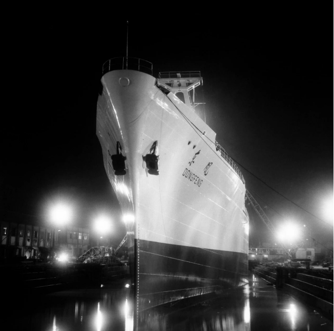 “一五”后期,研制萬(wàn)噸級(jí)遠(yuǎn)洋貨船被列為國(guó)家新科技規(guī)劃的重點(diǎn)項(xiàng)目。在西方長(zhǎng)期封鎖尤其是后來(lái)蘇聯(lián)中止援助的困難局勢(shì)下,“東風(fēng)”號(hào)是中國(guó)人首次嘗試自行設(shè)計(jì)、自行建造,全部采用國(guó)產(chǎn)設(shè)備的首艘萬(wàn)噸遠(yuǎn)洋船。1960年4月15日,“東風(fēng)”號(hào)下水,時(shí)任上海市委書記陳丕顯、副市長(zhǎng)曹荻秋等人出席下水典禮。萬(wàn)噸輪被命名為“東風(fēng)”號(hào)。