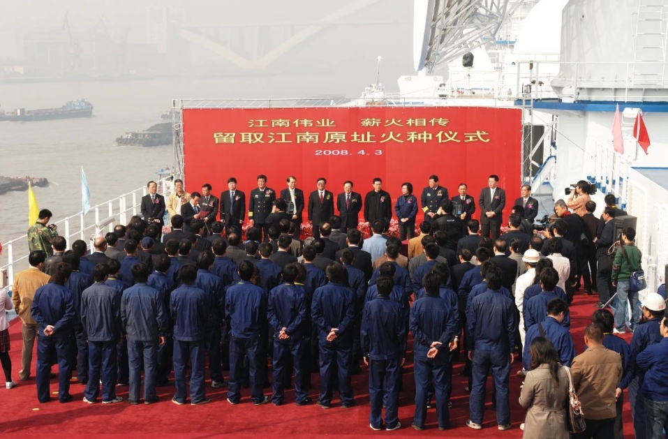 2008年4月,江南造船老廠建造的最后一艘船“遠(yuǎn)望6”號(hào)航天測(cè)量船即將交付。4月3日,時(shí)任江南造船搭載部部長(zhǎng)黃文飛作為取火者從“遠(yuǎn)望6”號(hào)船前甲板的上建位置手拿焊槍取火引燃火炬?;鹁嬉来蝹鬟f至勞動(dòng)模范、三八紅旗手、江南造船領(lǐng)導(dǎo)等,最后傳至?xí)r任中船集團(tuán)總經(jīng)理陳小津手中并由他點(diǎn)燃了火種盒。6月3日,江南造船人親手建造的船舶特地趕回“娘家”,載著江南“火種”駛往新基地,為新建造的產(chǎn)品開工點(diǎn)火。