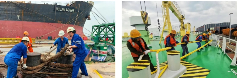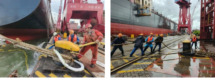 臺(tái)風(fēng)來臨前,聞“風(fēng)”而動(dòng)。緊急為單船加纜,將水上設(shè)備移入港池避風(fēng),拆除全部應(yīng)急梯,對(duì)纜樁開展地毯式排查,預(yù)先部署防臺(tái)橫纜,筑牢前置防線。針對(duì)受風(fēng)面積大的大型集裝箱船等重點(diǎn)產(chǎn)品,升級(jí)加固措施,加裝高強(qiáng)度纜繩等,為巨輪系緊“安全鎖”。