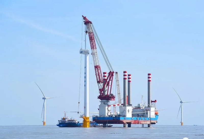 ????本次安裝難度大,30號(hào)風(fēng)機(jī)單葉片長(zhǎng)73.5米,旋轉(zhuǎn)直徑達(dá)158米,輪轂高度81米。塔筒共分為底、中、頂三段,風(fēng)機(jī)整體總重量790噸以上,相當(dāng)于500余輛小汽車(chē)的重量?!罢窠?hào)”平臺(tái)安裝3臺(tái)1800千瓦電力推進(jìn)全回轉(zhuǎn)舵槳,配備3臺(tái)750千瓦艏側(cè)推裝置。航速7節(jié),續(xù)航能力達(dá)3000海里,定員100人,平臺(tái)最大作業(yè)水深50米,甲板作業(yè)面積約2500平方米,可容納3套6兆瓦級(jí)風(fēng)機(jī)或2套8兆瓦級(jí)風(fēng)機(jī),并且可以獨(dú)立完成6兆瓦、8兆瓦級(jí)風(fēng)機(jī)的安裝和其他水上工程施工的起重、打樁、吊裝和運(yùn)輸?shù)茸鳂I(yè)。