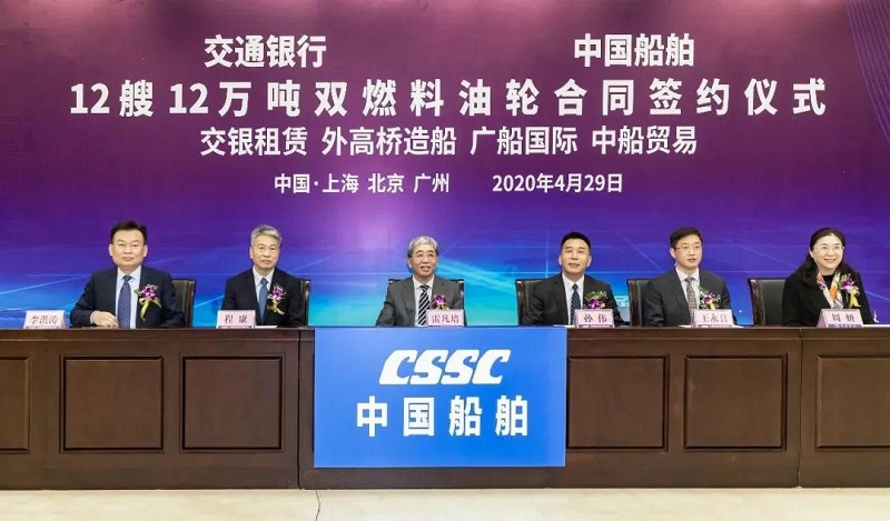 ????4月29日,中國船舶集團有限公司旗下中國船舶工業(yè)貿易有限公司、上海外高橋造船有限公司、廣船國際有限公司與交通銀行股份有限公司旗下交銀金融租賃有限責任公司在北京、上海、廣州三地以“云簽約”方式簽署12艘12萬噸雙燃料油船建造合同,合同總金額約46億元人民幣,這是中國船舶集團旗下單位近期承接的又一單筆大額訂單。中國船舶集團黨組書記、董事長雷凡培,交通銀行黨委書記、董事長任德奇,中國船舶集團黨組成員、副總經理孫偉,交通銀行黨委委員、副行長呂家進出席簽約儀式。