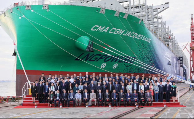 9月22日,由中國船舶集團有限公司旗下滬東中華造船(集團)有限公司和中國船舶工業(yè)貿(mào)易有限公司作為聯(lián)合賣方為世界著名航運公司——法國達飛海運集團建造的全球首艘23000TEU雙燃料動力集裝箱船“達飛雅克?薩德”號,在上海長興島造船基地命名交付。中國船舶集團副總經(jīng)理孫偉、達飛海運集團董事會主席魯?shù)婪颉に_德出席儀式并致辭,教母譚雅·薩德為新船命名,法國駐滬總領事紀博偉應邀出席儀式。
