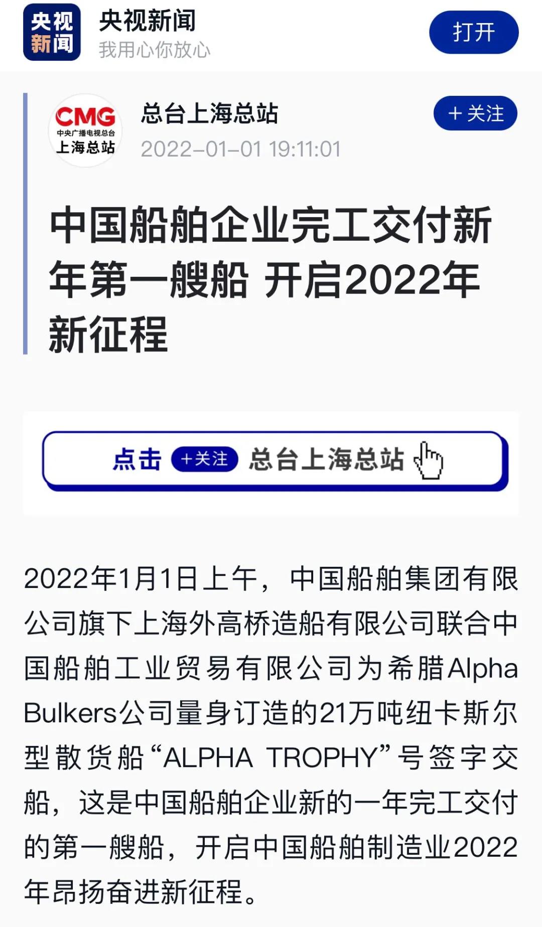 1月1日上午,中國(guó)船舶集團(tuán)旗下外高橋造船聯(lián)合中船貿(mào)易建造的21萬(wàn)噸紐卡斯?fàn)栃蜕⒇洿癆LPHA TROPHY”號(hào)簽字交船,這是中國(guó)船舶企業(yè)新的一年完工交付的第一艘船,開啟中國(guó)船舶制造業(yè)2022年昂揚(yáng)奮進(jìn)新征程。