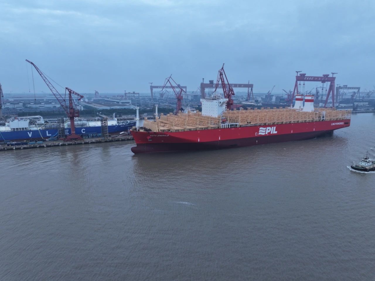 10月15日,中國船舶集團(tuán)旗下江南造船聯(lián)合中船貿(mào)易為太平船務(wù)建造的14000TEU液化天然氣(LNG)雙燃料動力系列集裝箱船首制船“KOTA EAGLE(鷹城)”號和2號船“KOTA EMERALD(翠城)”號同日命名,其中“KOTA EAGLE(鷹城)”號于當(dāng)日簽字交付。