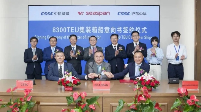滬東中華成功簽訂批量化8300TEU級(jí)集裝箱船和1艘18600立方米加注船的意向書(shū)。