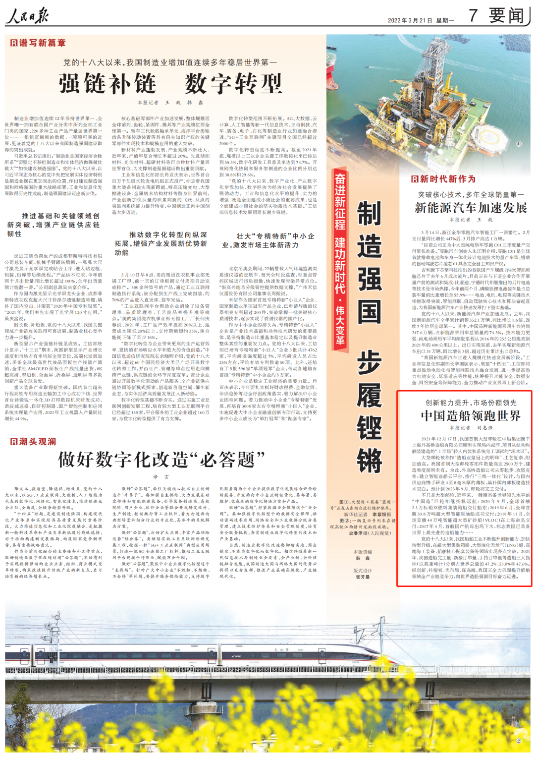 黨的十八大以來,我國船舶工業(yè)不斷提升創(chuàng)新能力、加快轉(zhuǎn)型升級,在超大型集裝箱船、大型液化天然氣(LNG)船、高端海工裝備、船舶核心配套裝備等領(lǐng)域?qū)崿F(xiàn)多點突破。2021年,我國造船完工量、新接訂單量、手持訂單量等造船三大指標(以載重噸計)分別占世界總量的47.2%、53.8%和47.6%。抓創(chuàng)新、補短板、優(yōu)布局、謀高端,我國正全力鞏固提升船舶領(lǐng)域全產(chǎn)業(yè)鏈競爭力,向世界造船強國目標奮力邁進。