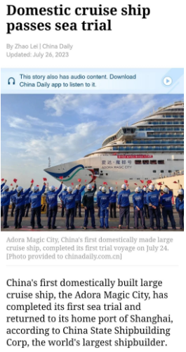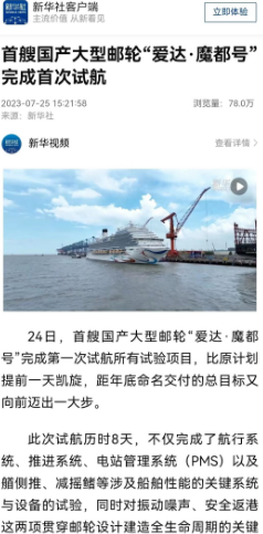 7月24日晚,首艘國(guó)產(chǎn)大型郵輪“愛(ài)達(dá)·魔都號(hào)”完成第一次試航所有試驗(yàn)項(xiàng)目比原計(jì)劃提前一天凱旋,人民日?qǐng)?bào)、新華社、中央電視臺(tái)等中央主流媒體進(jìn)行了報(bào)道。