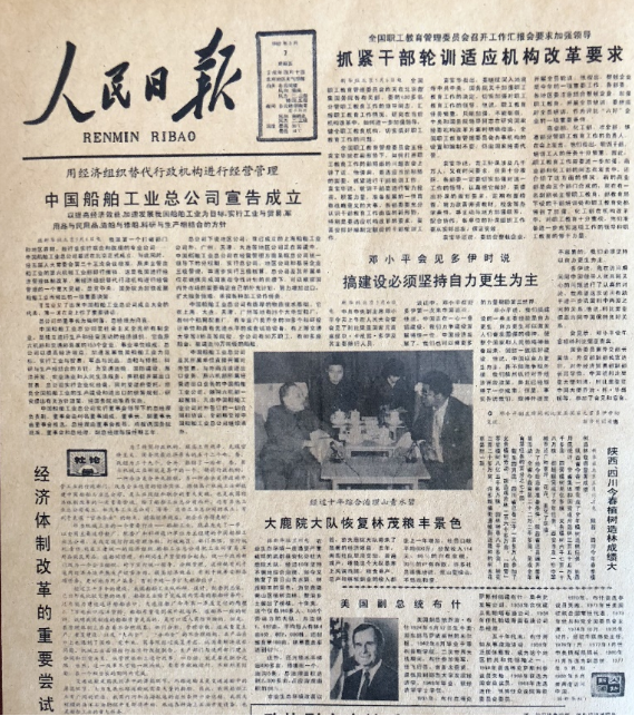 “改革開放是決定當(dāng)代中國命運(yùn)的關(guān)鍵一招?!?982年5月7日《人民日?qǐng)?bào)》頭版刊載文章:“用經(jīng)濟(jì)組織替代行政機(jī)構(gòu)進(jìn)行經(jīng)營管理——中國船舶工業(yè)總公司宣布成立”,標(biāo)題下文又著重強(qiáng)調(diào)“以提高經(jīng)濟(jì)效益,加速我國船舶工業(yè)為目標(biāo),實(shí)行工業(yè)與貿(mào)易,軍用品與民用品,造船與修船,科研與生產(chǎn)相結(jié)合的方針”。頭版還發(fā)表了以“經(jīng)濟(jì)體制改革的重要嘗試”為標(biāo)題的“社論”。在這期《人民日?qǐng)?bào)》的頭版還刊發(fā)了鄧小平同志接待外賓時(shí)的講話“搞建設(shè),必須堅(jiān)持自力更生為主”。
