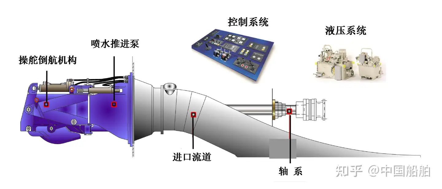 噴水推進裝置工作時,噴水推進泵的核心葉輪以每分鐘數(shù)千轉(zhuǎn)的速度切割水流,恰似高速旋轉(zhuǎn)的“風火輪”,將數(shù)噸水流由船尾方向噴射出去,推動船舶踏浪前行,當需要快速實現(xiàn)船舶或載體平臺的轉(zhuǎn)向和倒退時,只需要通過操縱舵倒航機構(gòu)分配和改變噴口水流方向即可。