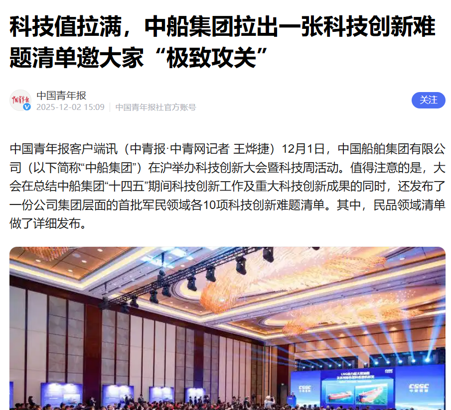 12月1-5日,中國船舶集團(tuán)有限公司在上海舉辦了科技創(chuàng)新大會暨科技周活動。