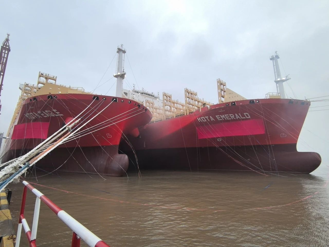 10月15日,中國船舶集團(tuán)旗下江南造船聯(lián)合中船貿(mào)易為太平船務(wù)建造的14000TEU液化天然氣(LNG)雙燃料動力系列集裝箱船首制船“KOTA EAGLE(鷹城)”號和2號船“KOTA EMERALD(翠城)”號同日命名,其中“KOTA EAGLE(鷹城)”號于當(dāng)日簽字交付。